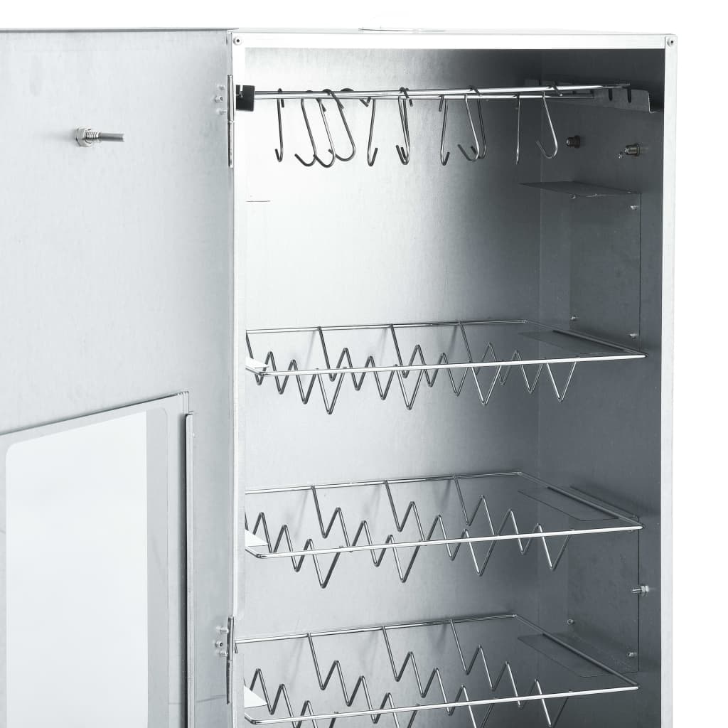 With this multi-functional oven smoker, you can smoke meat, fish, as well as sausages. Make a feast and enjoy outdoor get-together with your family! This smokehouse is equipped with a thermometer to keep you informed about the chamber temperature. Through the window, you can keep an eye on the food inside. The 124 cm tall smoking oven provides plenty of space for smoking the meat. The outdoor grill is made of galvanised steel and suitable for outdoor use. Thanks to the zinc plating on the rack, fire bowl and ash tray, the BBQ is rust resistant. Both the drawer and fire bowl are equipped with a handle. Additionally, 1kg wood chips and 12 S-shaped hooks are included in delivery. Do not use the barbecue in a confined and/or habitable space e.g. houses, tents, caravans, motor homes, boats. Danger of carbon monoxide poisoning fatality.